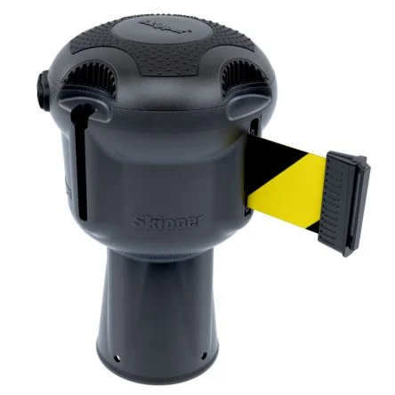 Skipper Retractable Tape Unit. These Skipper Units provide a versatile and highly-visible solution to cordon off any area as required. Skipper units simply click onto the top of Skipper traffic cones or can be used in conjunction with the Skipper post and base system. This Skipper unit houses 9 metres of retractable barrier tape which can be used again and again, saving time, money and space in the long-term versus throw-away barrier tape. FEATURES and BENEFITS:. . Robust and durable – suitable for exterior as well as interior use Light-weight, compact and easy to store Features built-in locking button to prevent unwanted spooling of tape Tape end clip can be attached by wrapping around a pillar or post and attaching to itself