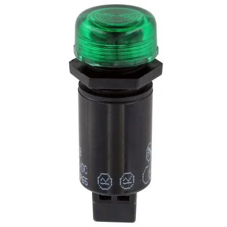 High visibility green LED indicator for panel mounting, ideal for various applications.
