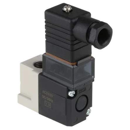 SMC Solenoid ValveThe SMC VT307 series 3/2 ports direct-acting solenoid valve has a 1/4in G port connection thread size. It required supply voltage of 240VAC. This new direct-acting solenoid valve offers a large flow capacity and reduced power consumption as compared to the existing models. It has voltage surge suppression.Features and BenefitsOperating temperature ranging between -10°C and 50°C Operating pressure ranging between 0MPA and 0.7MPa Body ported Interchangeable with the existing range Universal porting type Dust-proof enclosure Unrestricted mounting orientation Non-locking push type manual override Easily converted from N/C to N/O by an inverting function plateApplicationsBlow-of valves Pressure release valves single acting cylinder drives Divider valves and double acting cylinder drives Selector valve Valve for vacuum Divider valveCertificationsIP65 protection