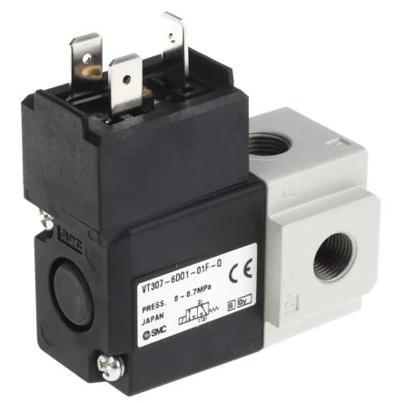 SMC Solenoid ValveThe SMC VT307 series 3/2 ports direct-acting solenoid valve has a 1/8in G port connection thread size. It required supply voltage of 12VDC. This new direct-acting solenoid valve offers a large flow capacity and reduced power consumption as compared to the existing models.Features and BenefitsOperating temperature ranging between -10°C and 50°C Operating pressure ranging between 0MPA and 0.7MPa Body ported Interchangeable with the existing range Universal porting type Available without a DIN 43650 connector Dust-proof enclosure Unrestricted mounting orientation Non-locking push type manual override Easily converted from N/C to N/O by an inverting function plateApplicationsBlow-of valves Pressure release valves single acting cylinder drives Divider valves and double acting cylinder drives Selector valve Valve for vacuum Divider valveCertificationsIP65 protection