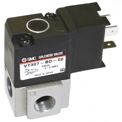 VT307 Series Direct-Acting Solenoid Valve. SMC have updated their EVT307 valve range with the new VT307 series. These new direct acting solenoid valves offer reduced power consumption over existing models and are available with both vacuum and energy-saving versions. Available with voltage surge suppression. Suitable for a diverse range of applications including Blow-of valves, Pressure release valves, single acting cylinder drives, Divider valves and double acting cylinder drives. Body ported Interchangeable with existing range Universal porting type Available with DIN 43650 connector with IP65 protection Dust-proof enclosure Unrestricted mounting orientation Non-locking push type manual override Various functions: N/O, N/C, Divider valve, Selector valve Available with voltage surge suppression Easily converted from N/C to N/O by inverting function plate