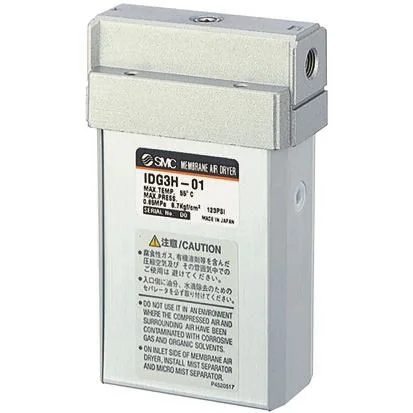 Flow rates measured as outlet/purge l/min. IDG Series, Membrane Air Dryer. SMC's Membrane air dryer series IDG is available in a single unit or combination unit style. IDG/M models combine a mist separator and micro mist separator with a single unit. IDG/V models combine a regulator with the IDG/M model. Options available include one-touch fitting exhaust of purge air. If purged air is not exhausted around membrane air dryer, air is exhausted with tubing away from its dryer. A reliable, efficient and an economical alternative to pressure swing and refrigerant dryer technologies. Compact and lightweight No power supply required Discharged air noise reduced with in-built silencer No vibration or heat discharge Modular design for additional filtration Membrane air dryer series Single unit style Various sizes available Port sizes: 1/8" to 1/2"
