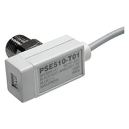 Compact Pneumatic Pressure Sensor. Series PSE digital pressure switches allow pressure to be controlled from a remote location. The PSE100 series controller has an easy to read, large, 4-digit LED display. Display units can be easily selected and changed. Series PSE510 is compact and lightweight, allowing the sensor to be mounted where needed. The use of stainless steel for all wetted parts (SUS630 for diaphragm, SUS304 for fitting) allows the PSE520 pressure sensor to be used in a wide variety of gas and fluid applications. PSE series remote pressure and vacuum sensors have been expanded to include easy-to-use econ connectors from 3M or AMP.