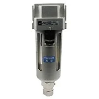 SMC - AMJ Series Drain Separators for Vacuum. Removes water droplets from air by simply installing in vacuum equipment connection lines. Effective for removing water droplets from the air sucked into vacuum pumps and ejectors, etc. Over 90% of droplets can be removed through the use of a special water droplet removing element. The provision of a drain cock makes it possible to discharge the drain manually after breaking the vacuum. Even when the element is saturated with water, there is almost no drop in pressure (increase in resistance). The element can be replaced with a single touch.