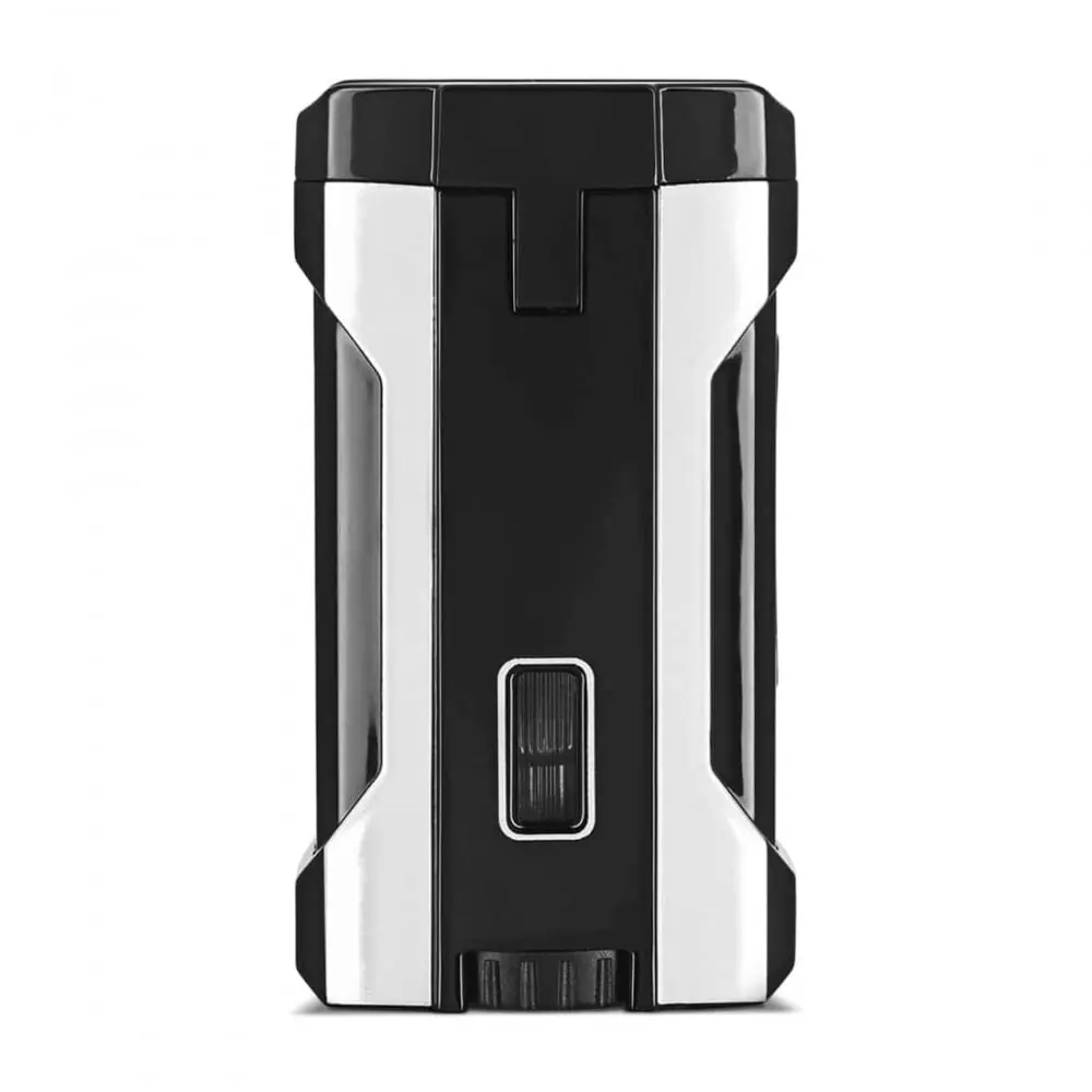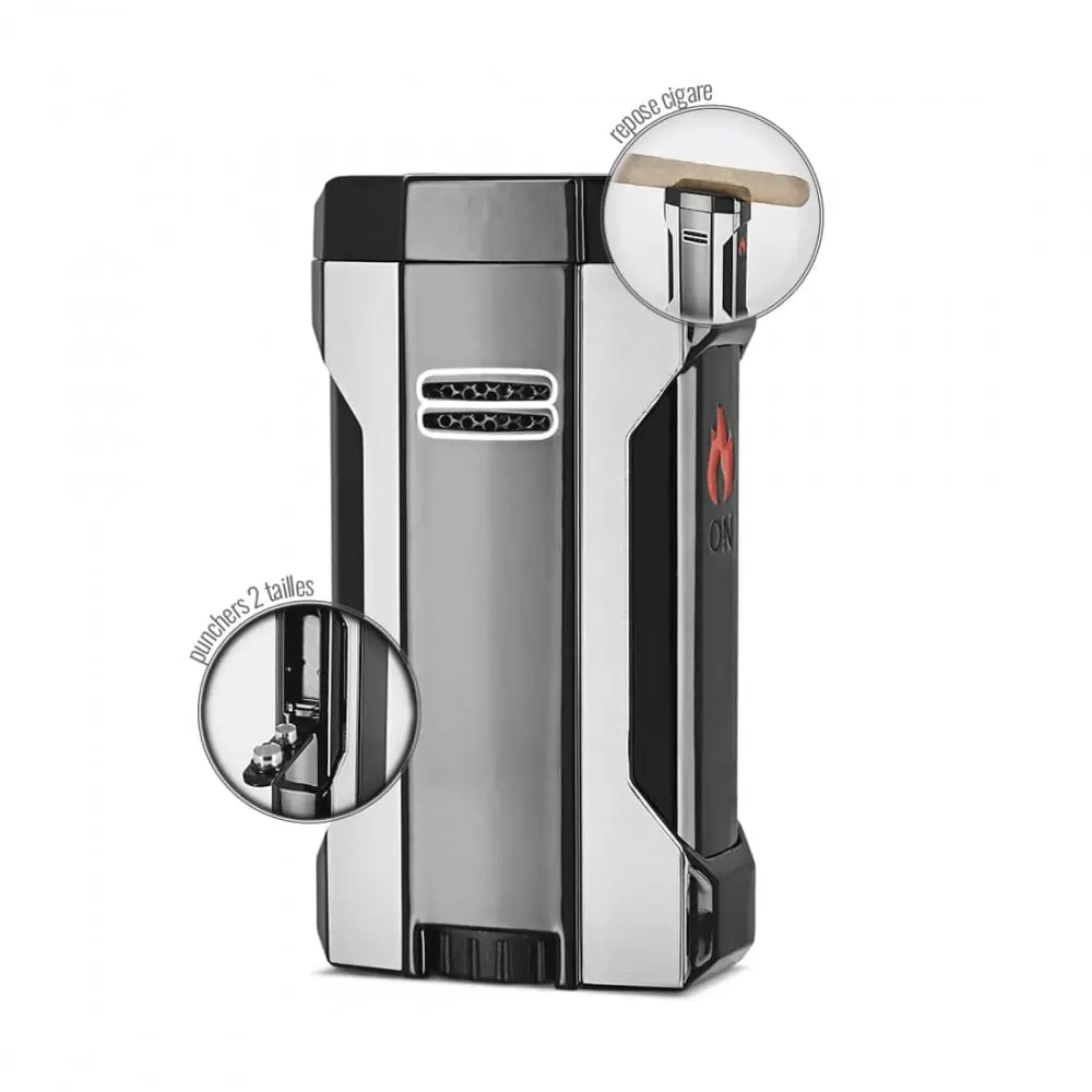 3-in-1 table cigar lighter with lighter part with 4 torch flames cigar rest (curved lighter top) and cigar cutter (2 sizes puncher in the lighter). made of metal and plastic black and gray in color.