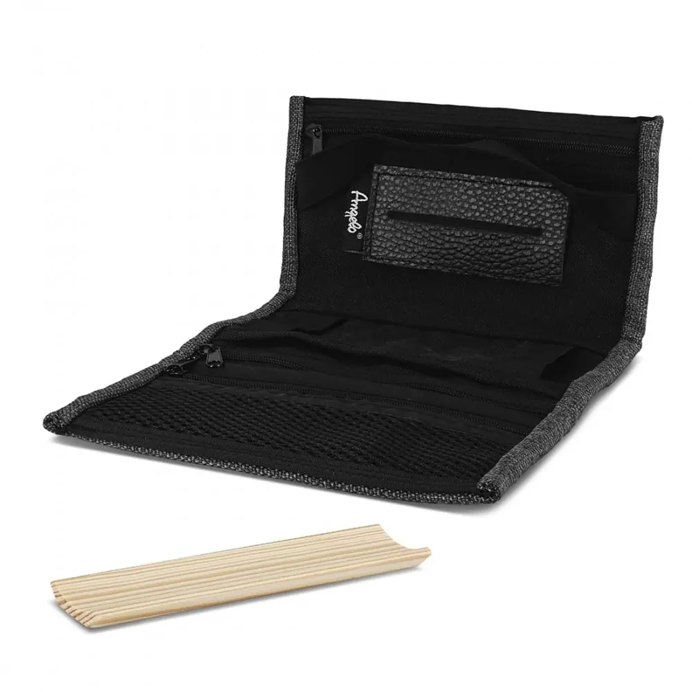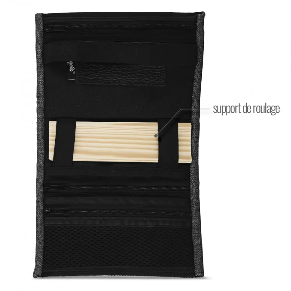 Angelo tobacco pouch in gray fabric with elastic closure. Several interior compartments: tobacco leaves, filters, and accessories.