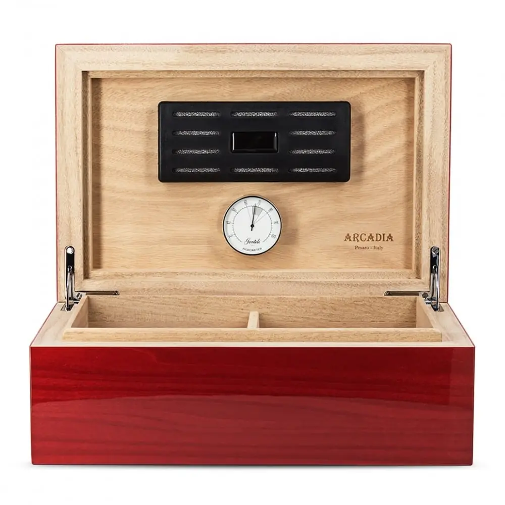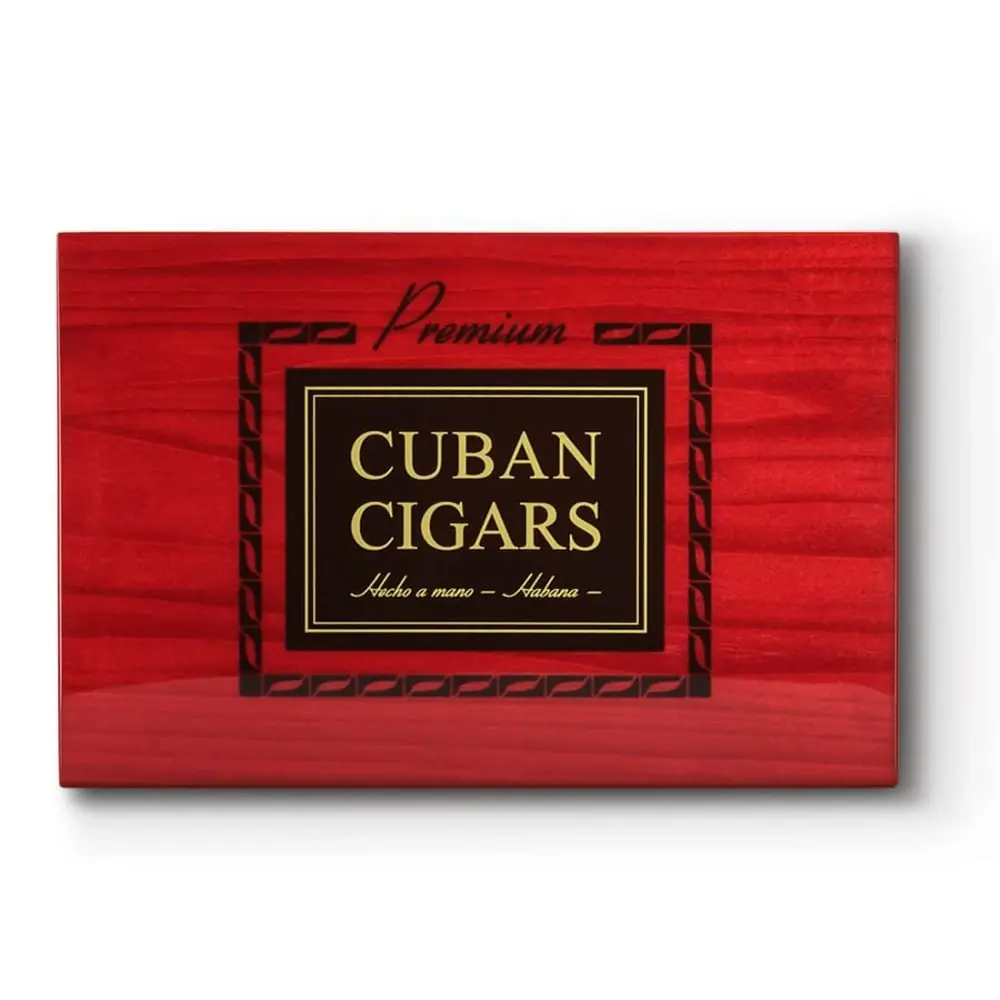 "premium cuban cigars" inscription in black and gold on the top of the humidor.