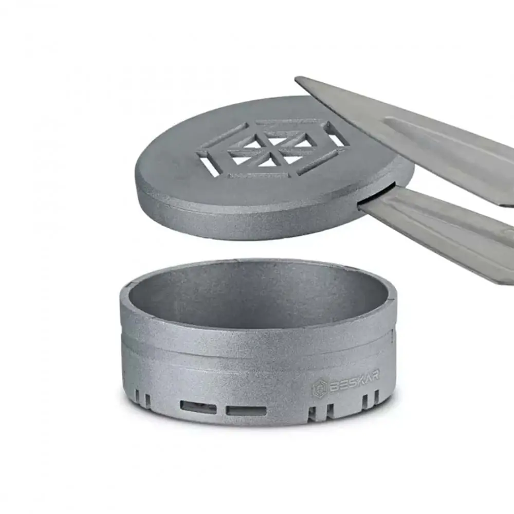 the beskar rebel charcoal heating system revolutionizes the shisha experience with its one-piece aluminum design and exclusive air circulation system offering uniform combustion and dense smoke. its innovative design allows you to insert up to three cubes of charcoal without breaking them thus offering optimal flexibility to adjust the heating intensity. thanks to its convenient notches handling the hood is child's play providing an unparalleled shisha experience with every puff.