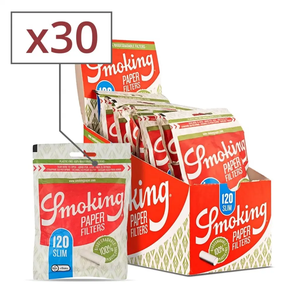 Set of 30 bags each containing 120 slim biodegradable filters from the smoking brand. These filters are made from 100% biodegradable cellulose as is their packaging providing an eco-friendly option for smokers. With a diameter of 6mm and a length of 15mm these filters are ideal for homemade slim cigarettes.