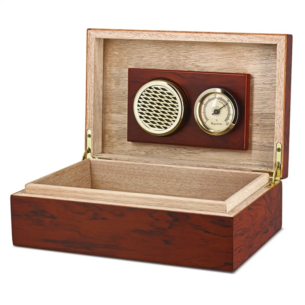 the bordeaux wooden cigar humidor is equipped with a built-in humidifier and needle hygrometer offering a storage capacity for approximately 50 cigars. its elegant dark wood finish tending towards bordeaux makes it an accessory of choice for cigar lovers.