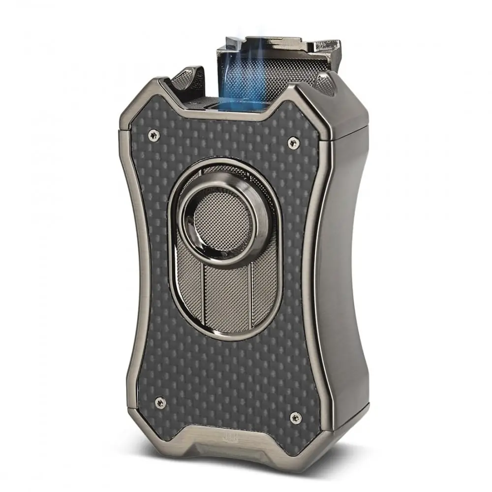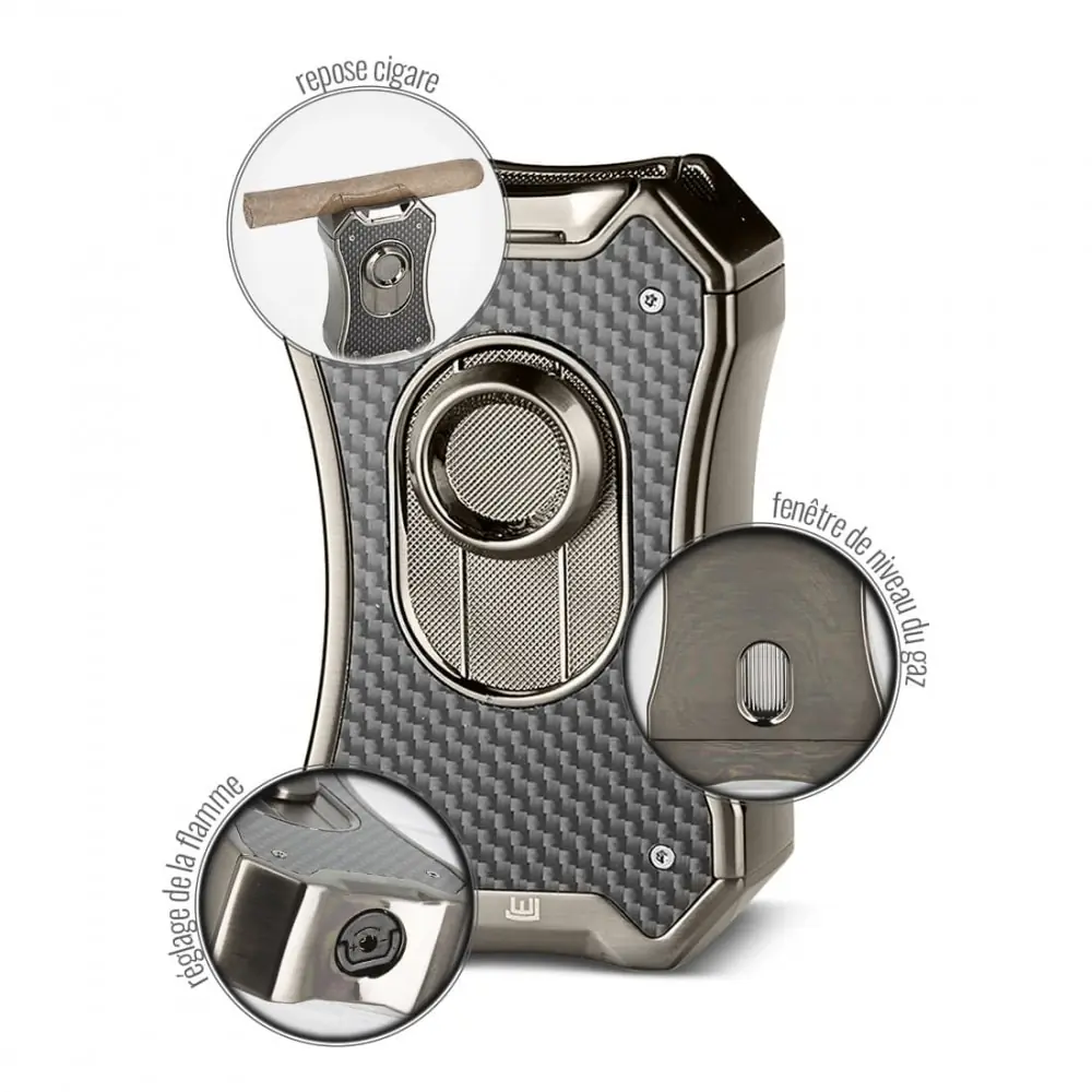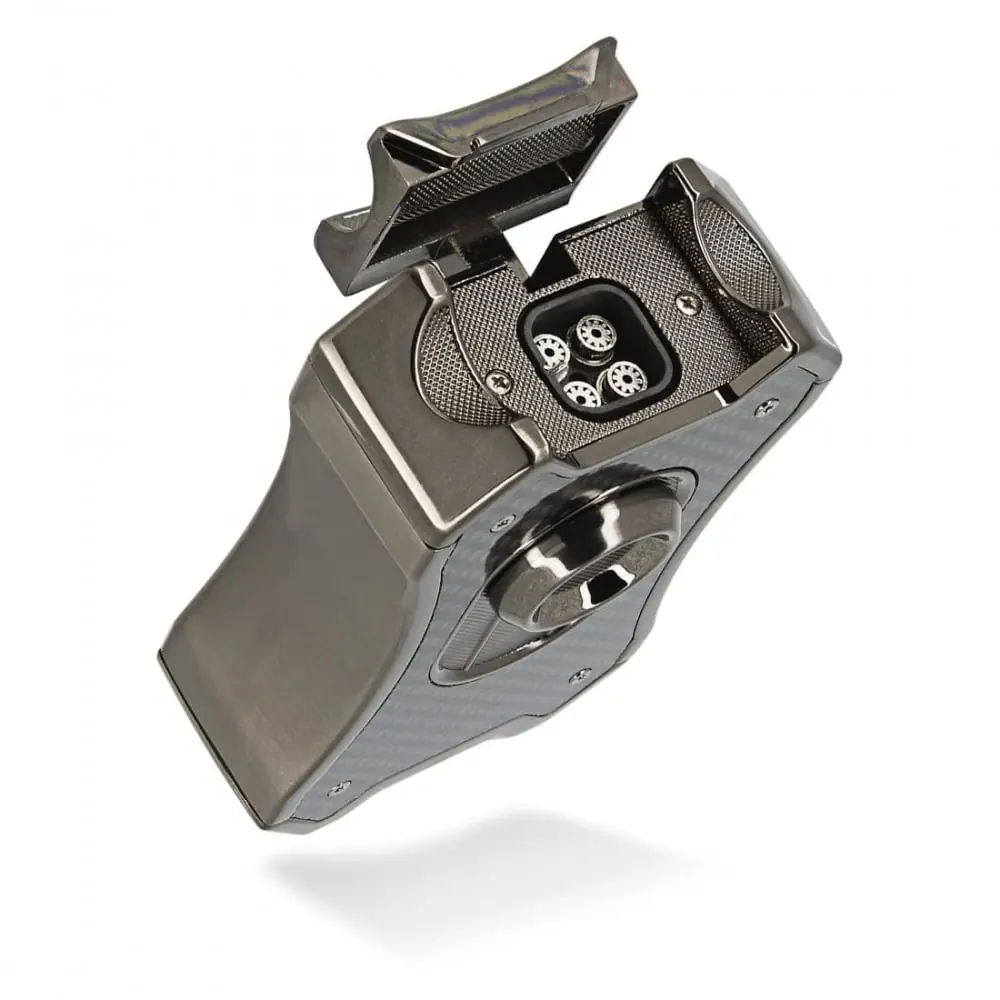 the 4-flame carbon table storm lighter combines performance and elegance. with four powerful flames it lights your cigars with ease and its carbon housing adds a touch of style to your moments of relaxation. its curved top allows you to place your cigar on it.