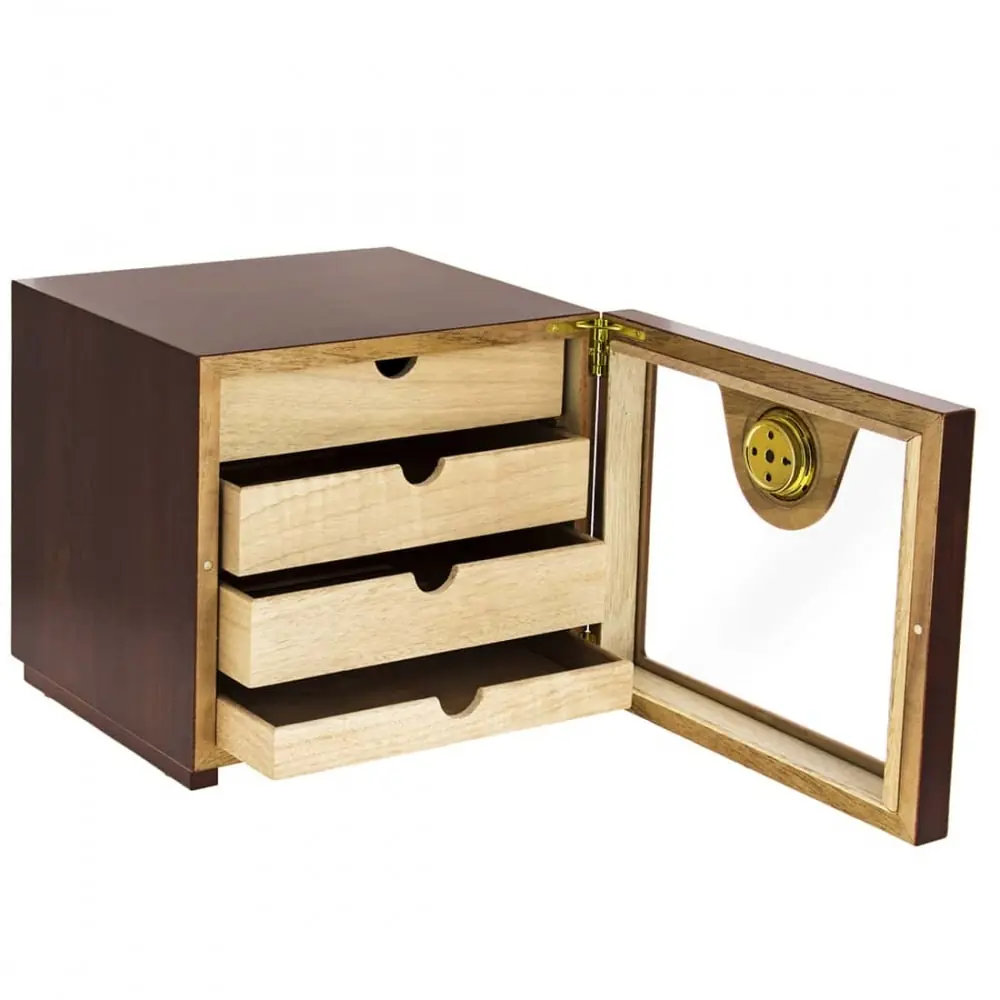 cubic cigar humidor with 4 cedar wood drawers. cherry wood and glazed exterior. hygrometer 4 humidifier 3 separators included.