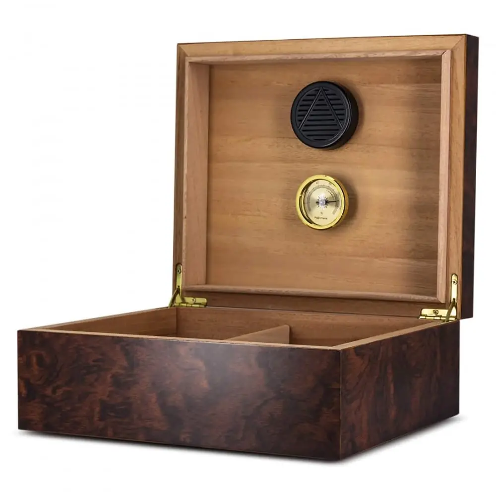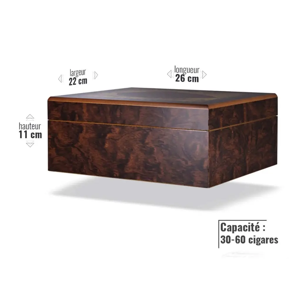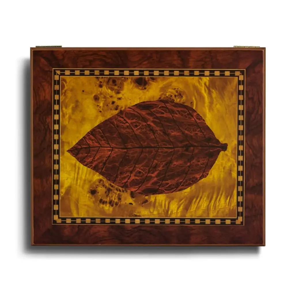 Humidor for cigars including a very beautiful tobacco leaf pattern. This cigar box will allow you to store fifty cigars that you can divide into two varieties thanks to the separator provided. Also included is a hygrometer and a humidifier.