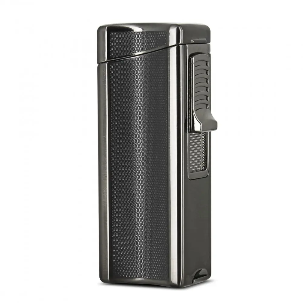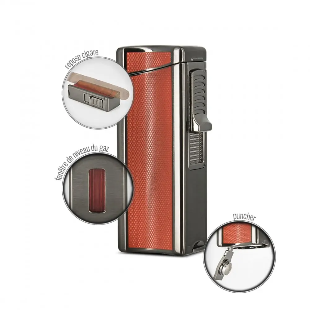 cigar lighter with 3 essential skills for cigar smokers. it makes it possible of course to easily light a cigar thanks to its powerful torch flame but also to make a hole in the end of it thanks to its cookie cutter located below and finally to put its cigar with its curved closing valve.. . matter. metal.
