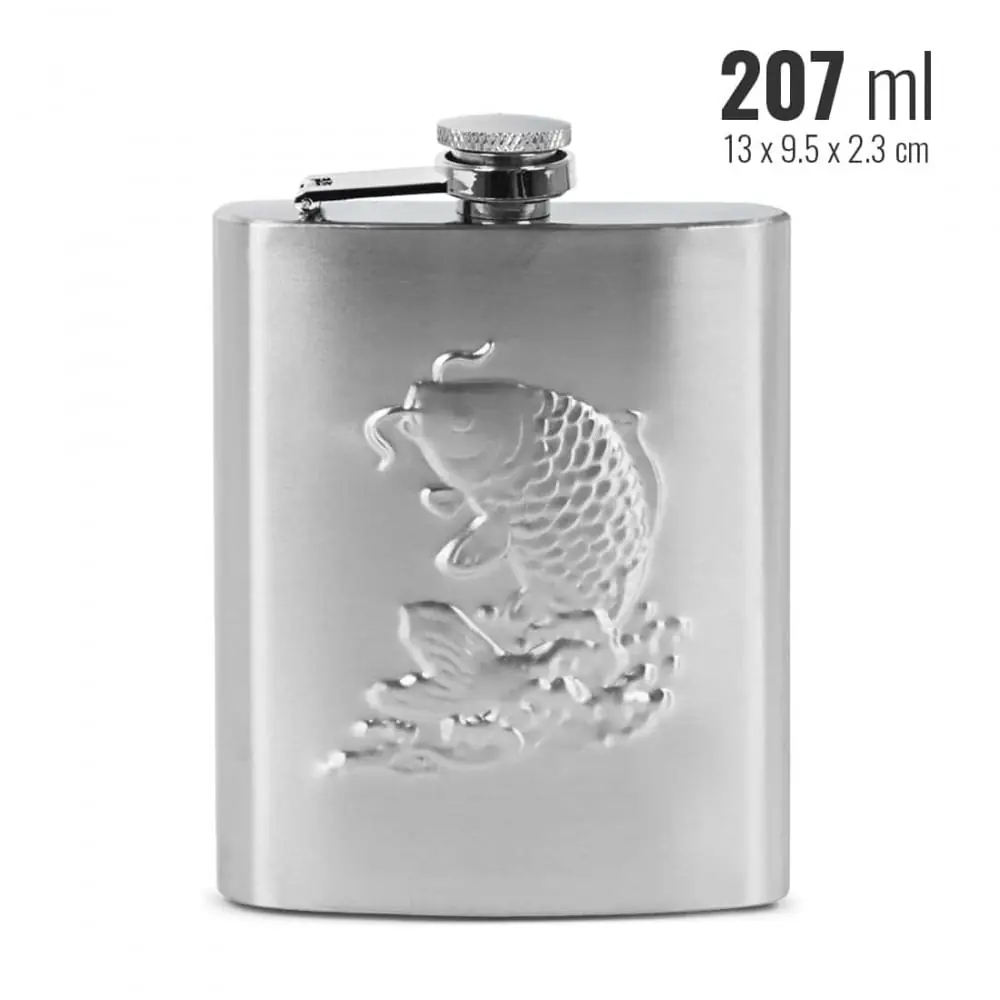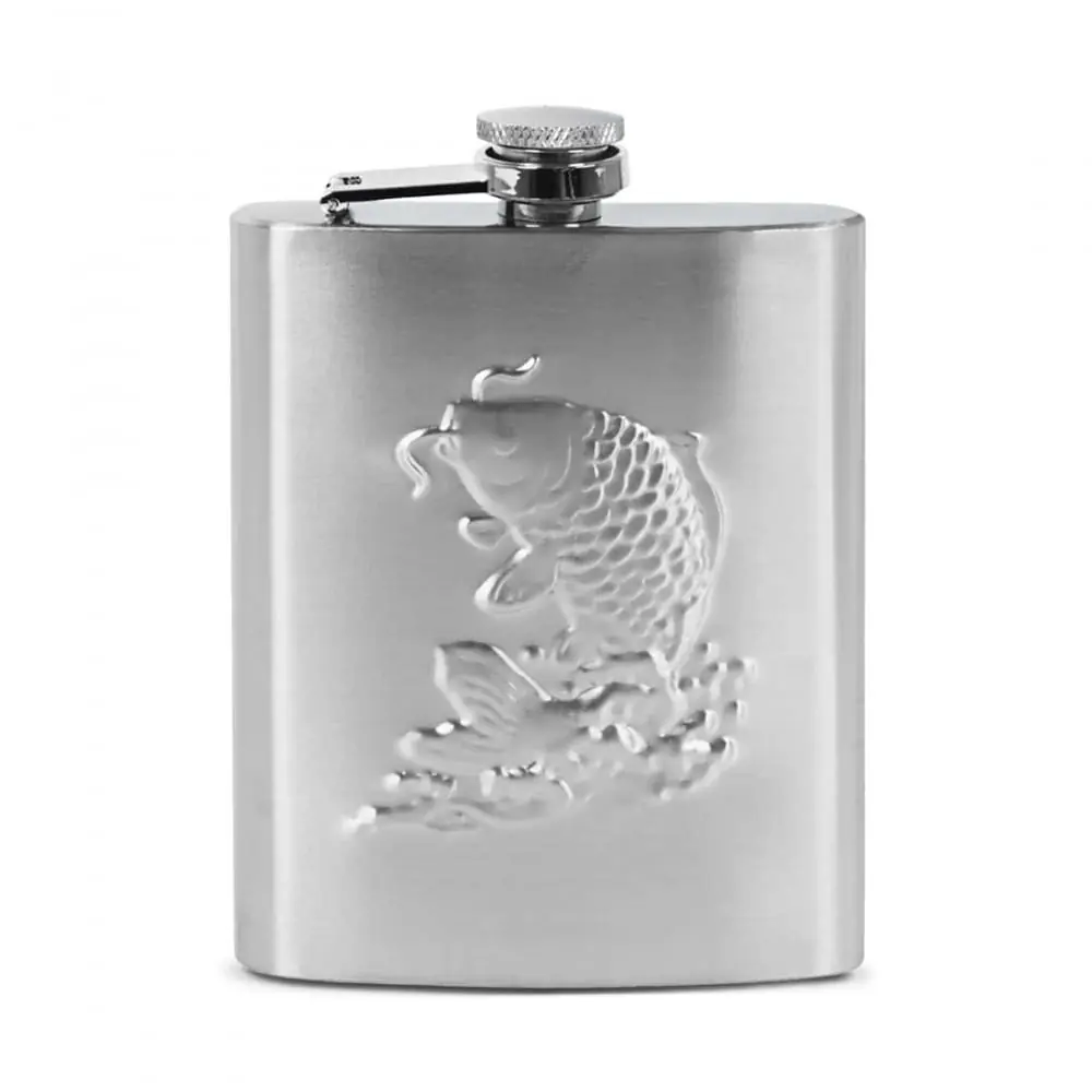 stainless steel alcohol flask with embossed fish motif. elegant discreet and easy to carry it is ideal for outings or as an original gift idea.