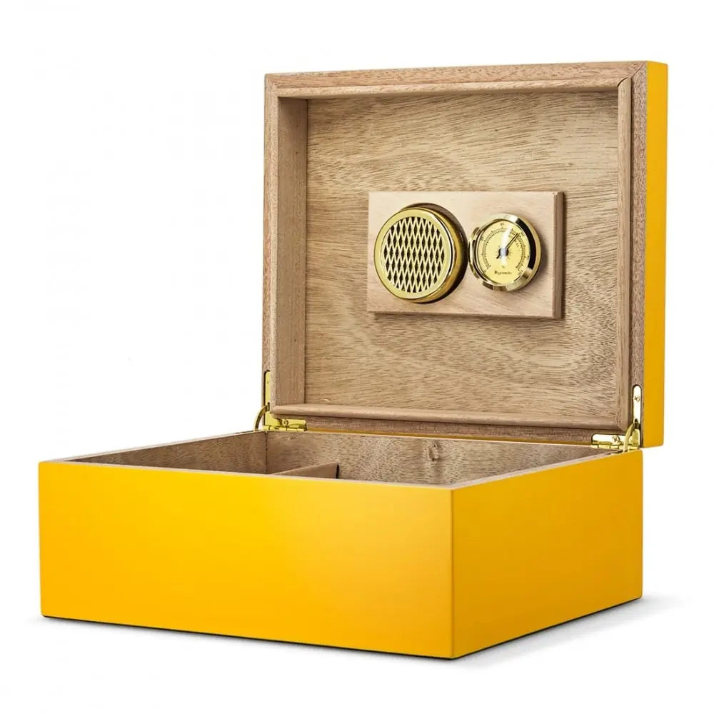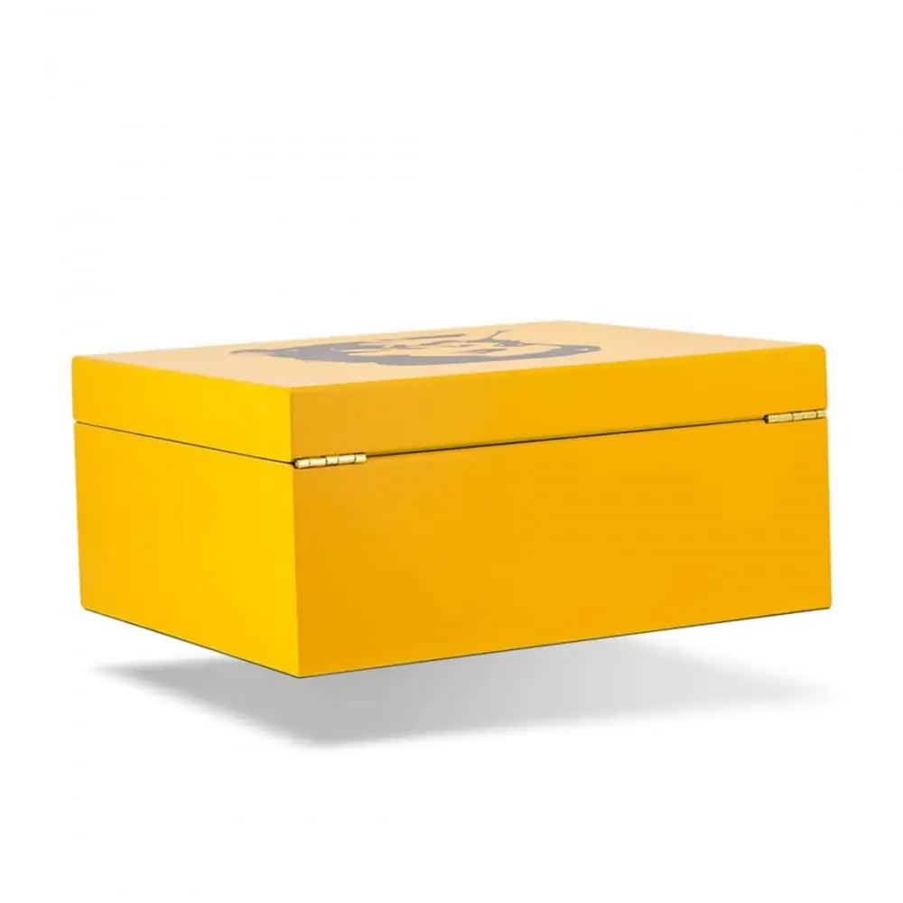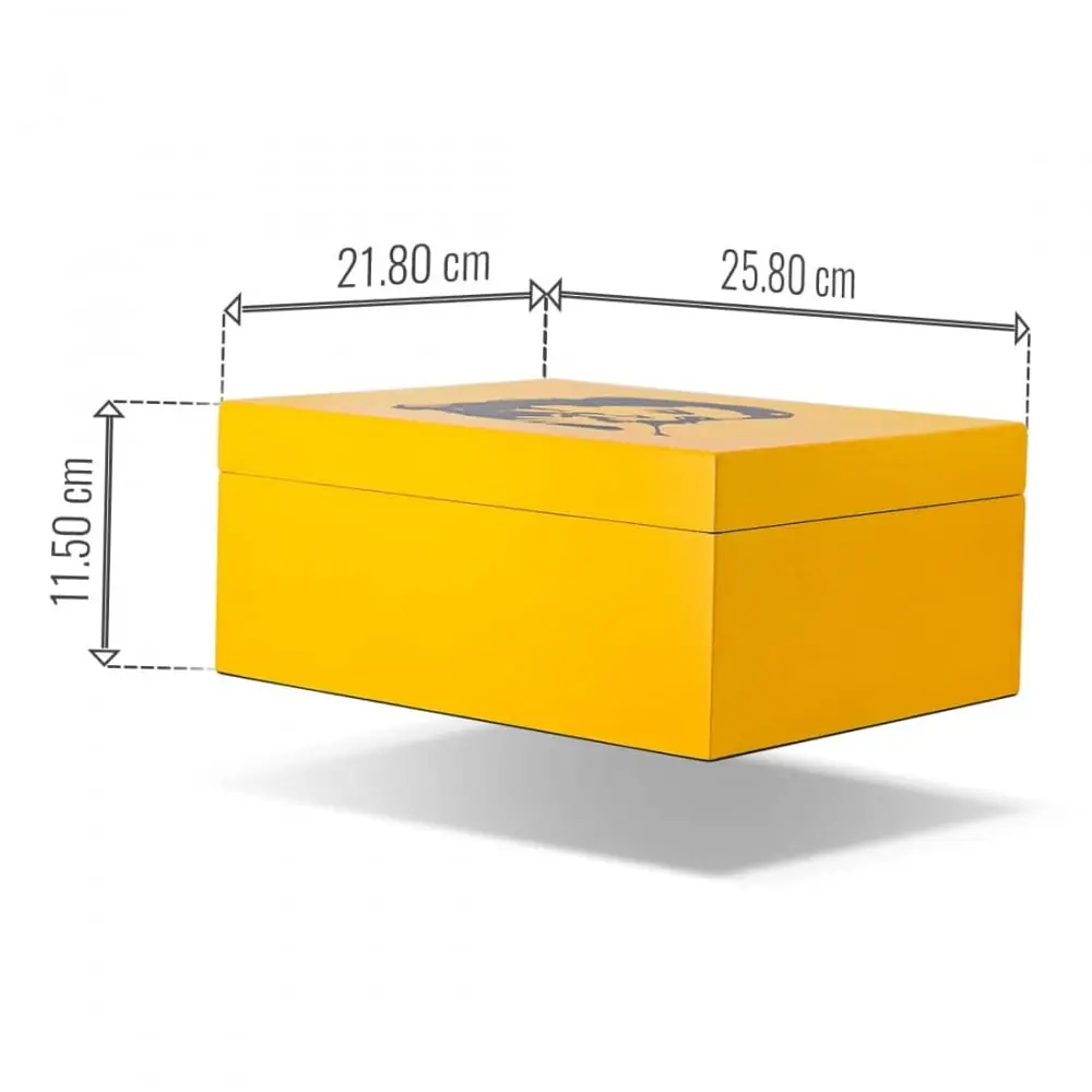 Beautiful cigar humidor all in yellow dressed and decorated with the face of Che in black on the top of the humidor. This will protect your cigars thanks to its humidifier and hygrometer delivered with it as well as thanks to its cedar wood interior. A removable divider is also included allowing you to store and sort your cigars according to their provenance size etc.
