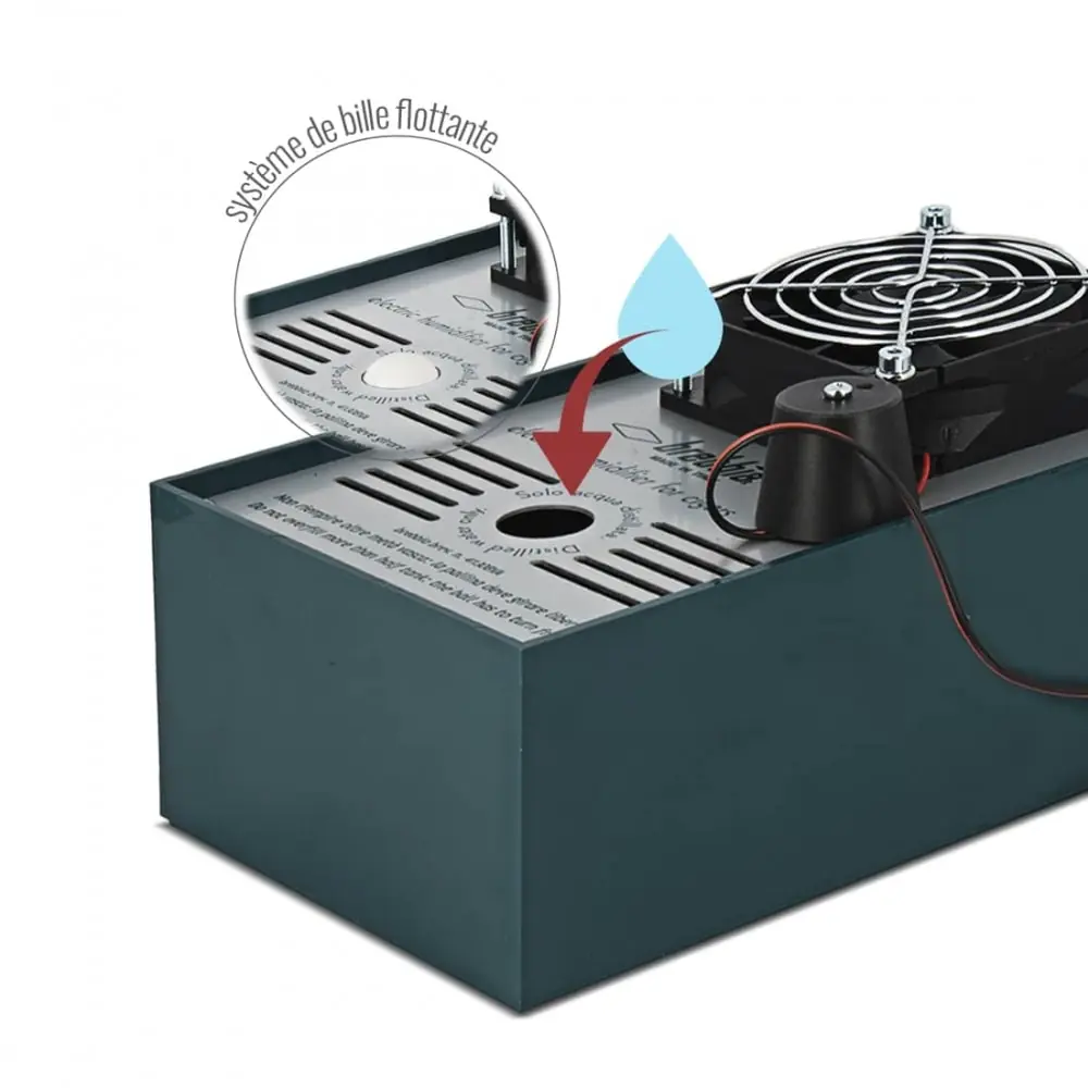 This electronic humidifier works thanks to an internal ball that rotates and humidifies itself. Forced ventilation dries the ball transforming the air into humidity that is diffused. When the ball becomes noisy it is necessary to humidify slowly to avoid the development of mold and bacteria.