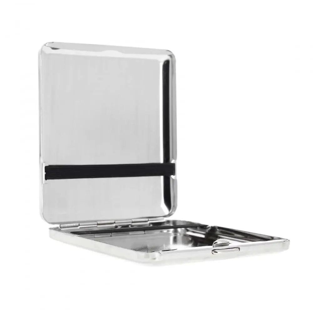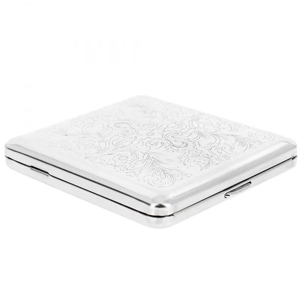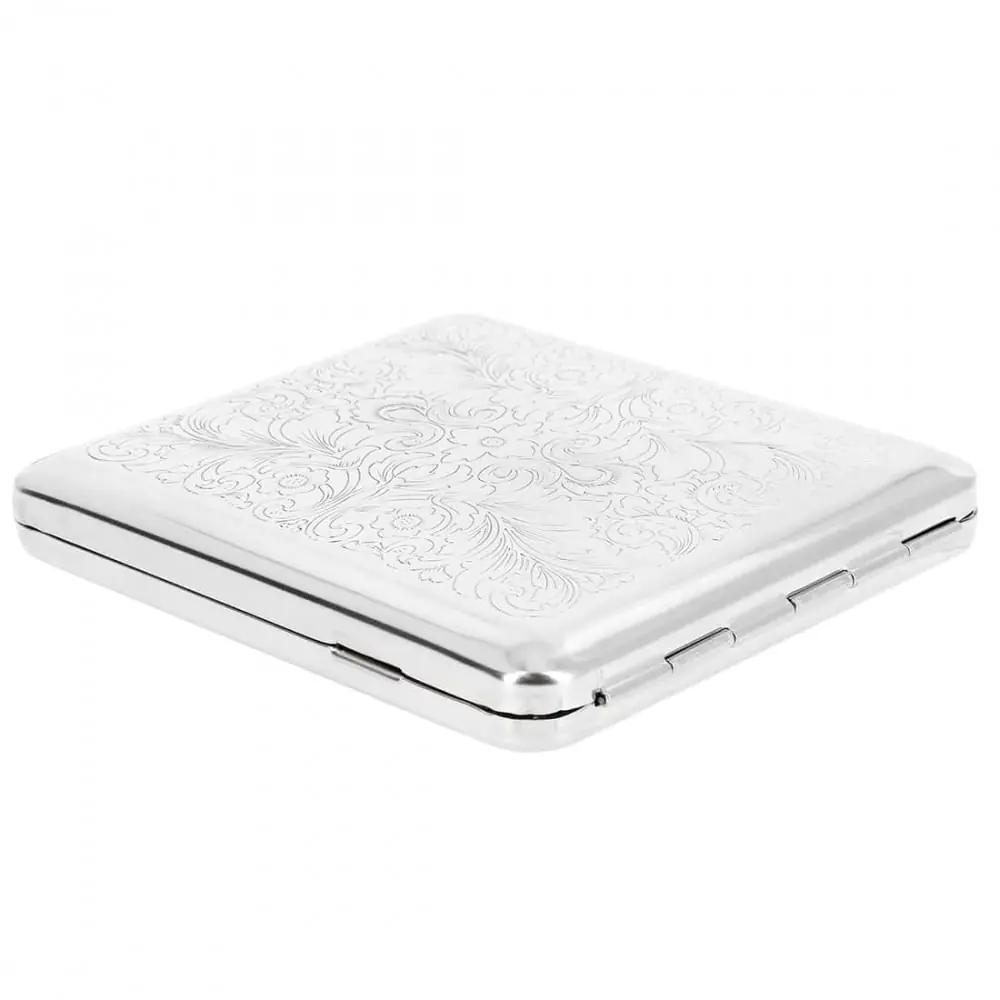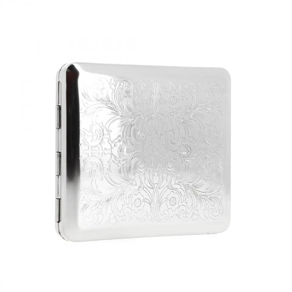 Floral metal cigarette case: suitable for standard size cigarettes. Rigid: yes. Capacity of 18 cigarettes maximum. Holding cigarettes with an elastic on each side.