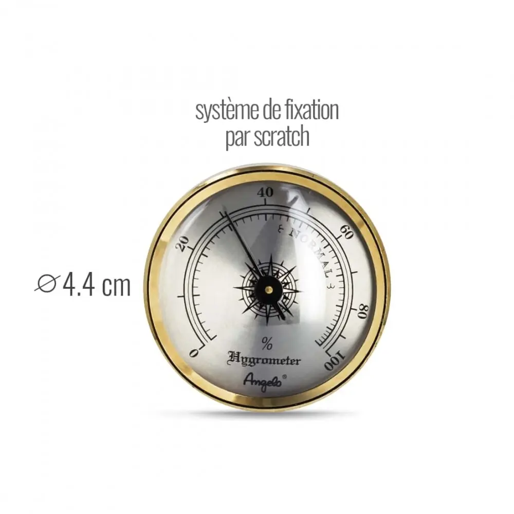 golden hygrometer with velcro attachment provided to measure the humidity level of your cigar cellar. golden it will easily fit on any cigar box.