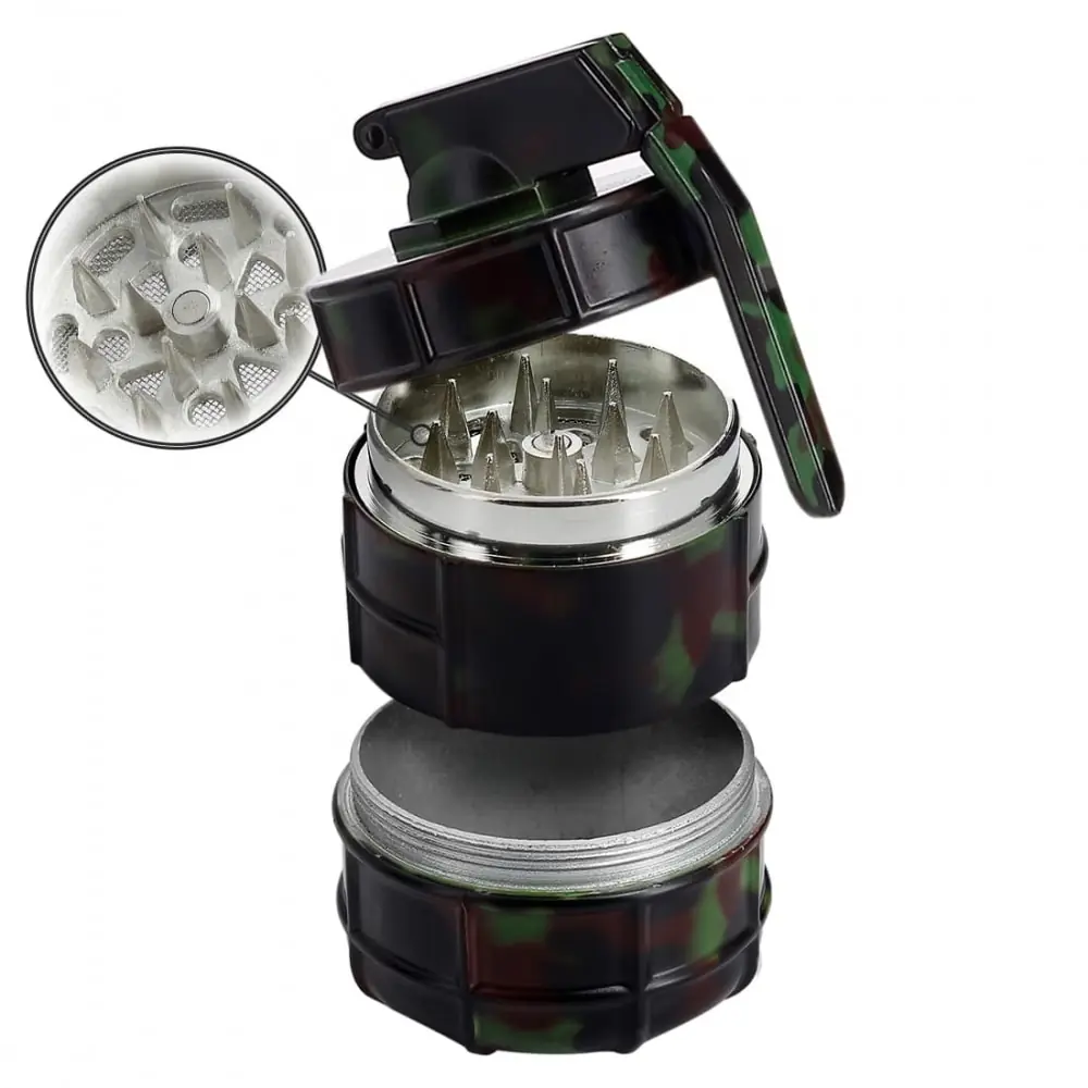 metal grinder in the shape of a flash grenade.. composed of 3 parts.. with diamond-shaped teeth and sieve..