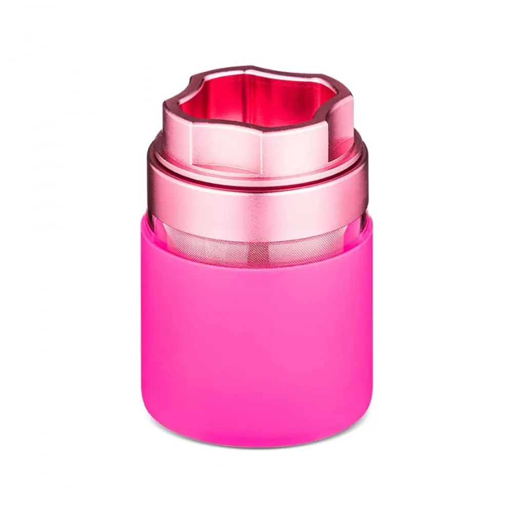 Grinder with glass collection pot. Integrated sieve. The rest of the grinder is made of metal and silicone. Neon pink color.