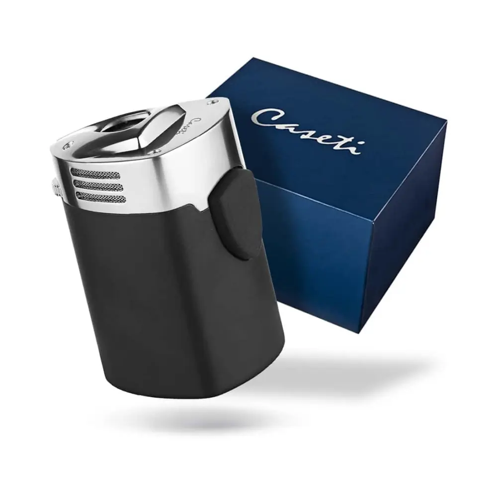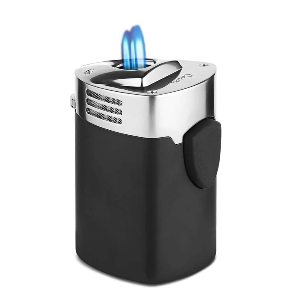 table lighter in chrome and matte black metal. it has an electronic ignition offering three powerful torch flames adjustable in intensity via an adjustment dial located under the flames. material metal colors matt black chrome presentation this table lighter will be delivered to you perfectly packaged and protected.