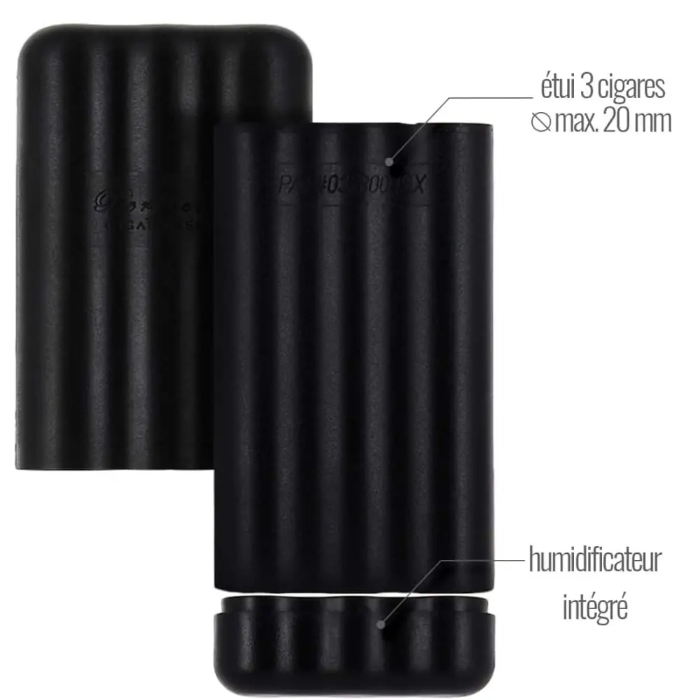 Ingenious and robust, this black perfecto 3-cigar case in ABS plastic can be adjusted to the size of your cigar. Also equipped with a humidification system, this perfecto cigar case will keep your cigars in good condition so that you can fully appreciate them when tasting them.
