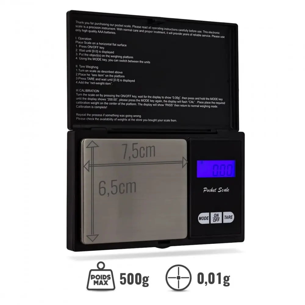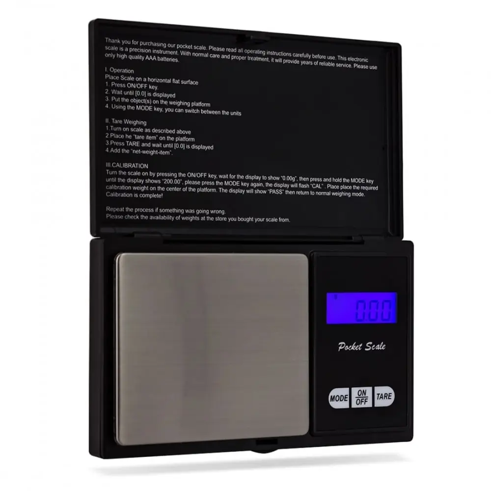 precision digital scale with 3 buttons: mode on/off tare. weighs up to 500 g with extreme precision to within 0.01 g!