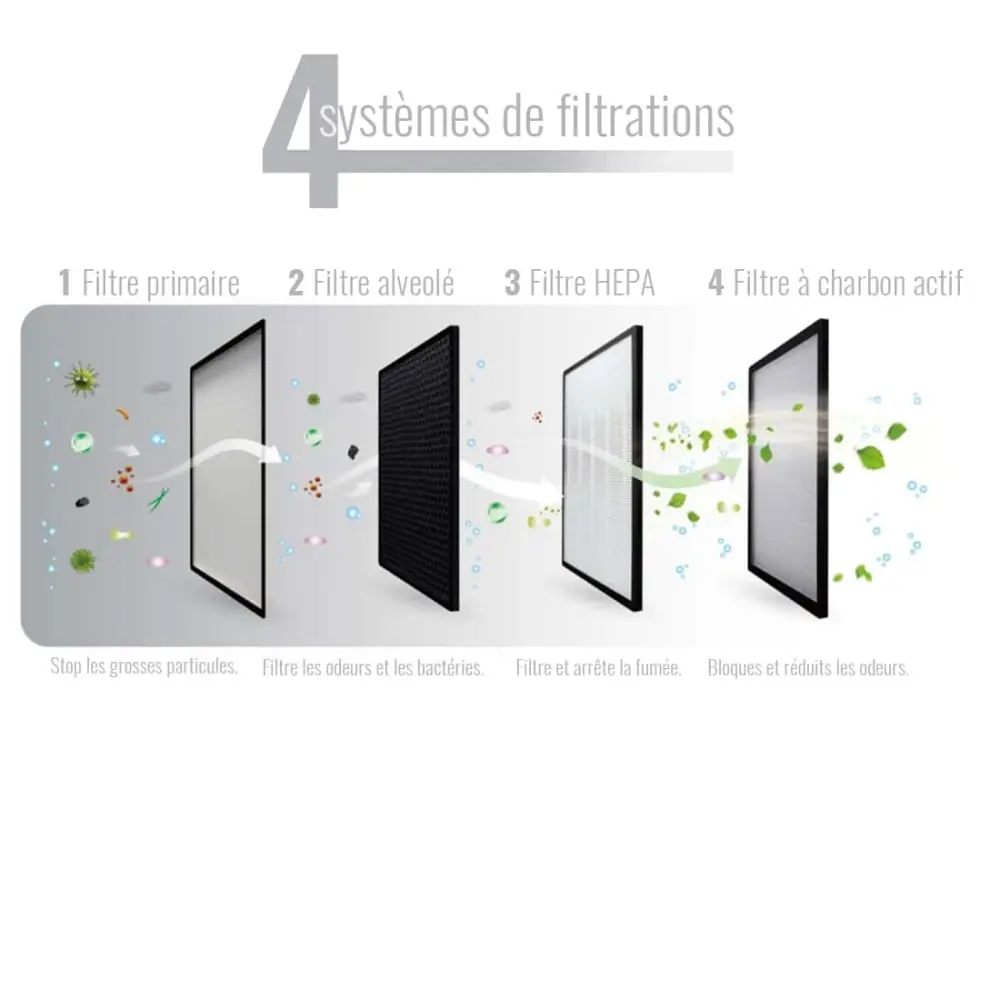 - Activated carbon filter: for further reduction, more effective against tobacco odors