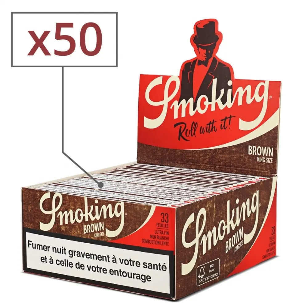 Smoking slim brown rolling paper box of 50 booklets of 33 superior quality rolling papers.