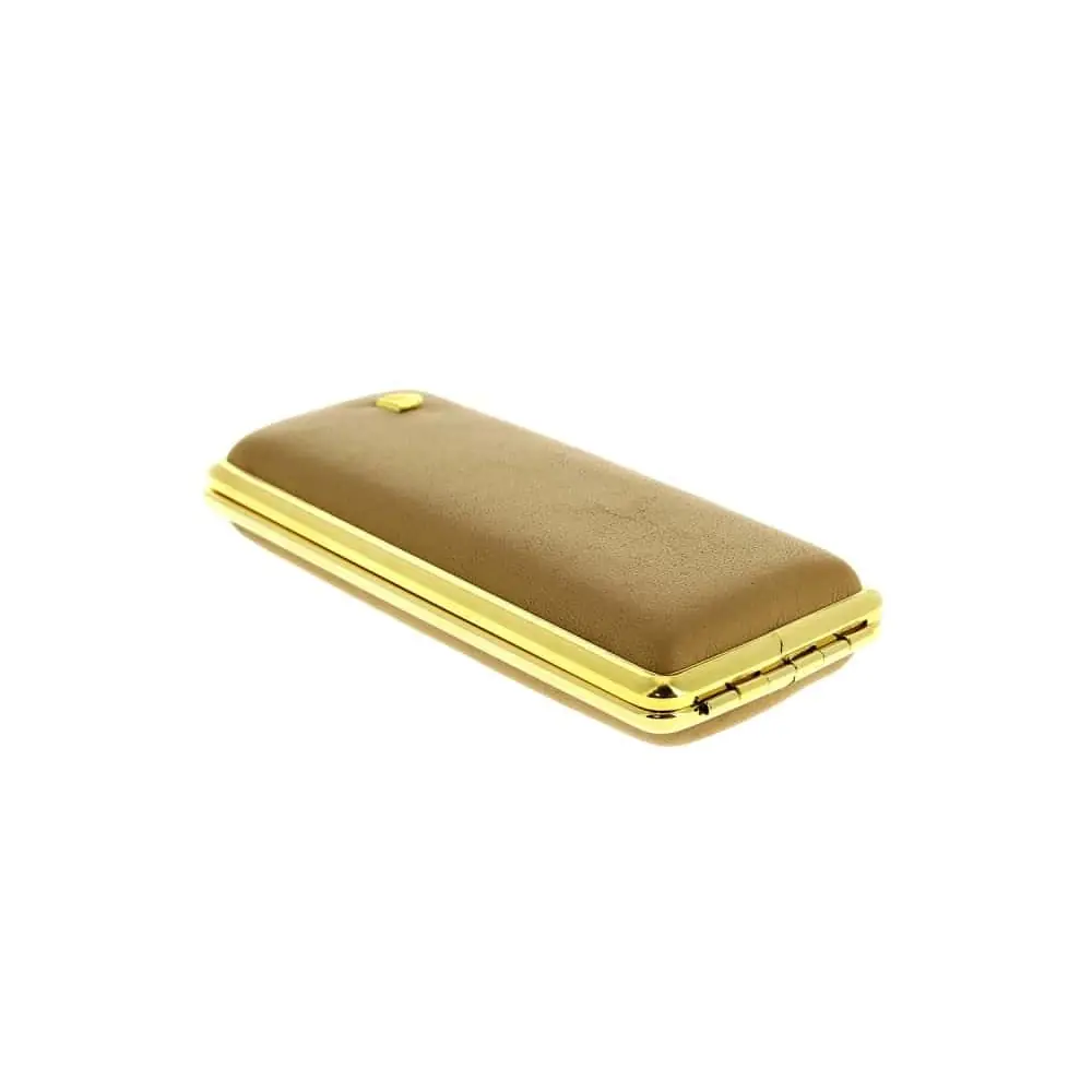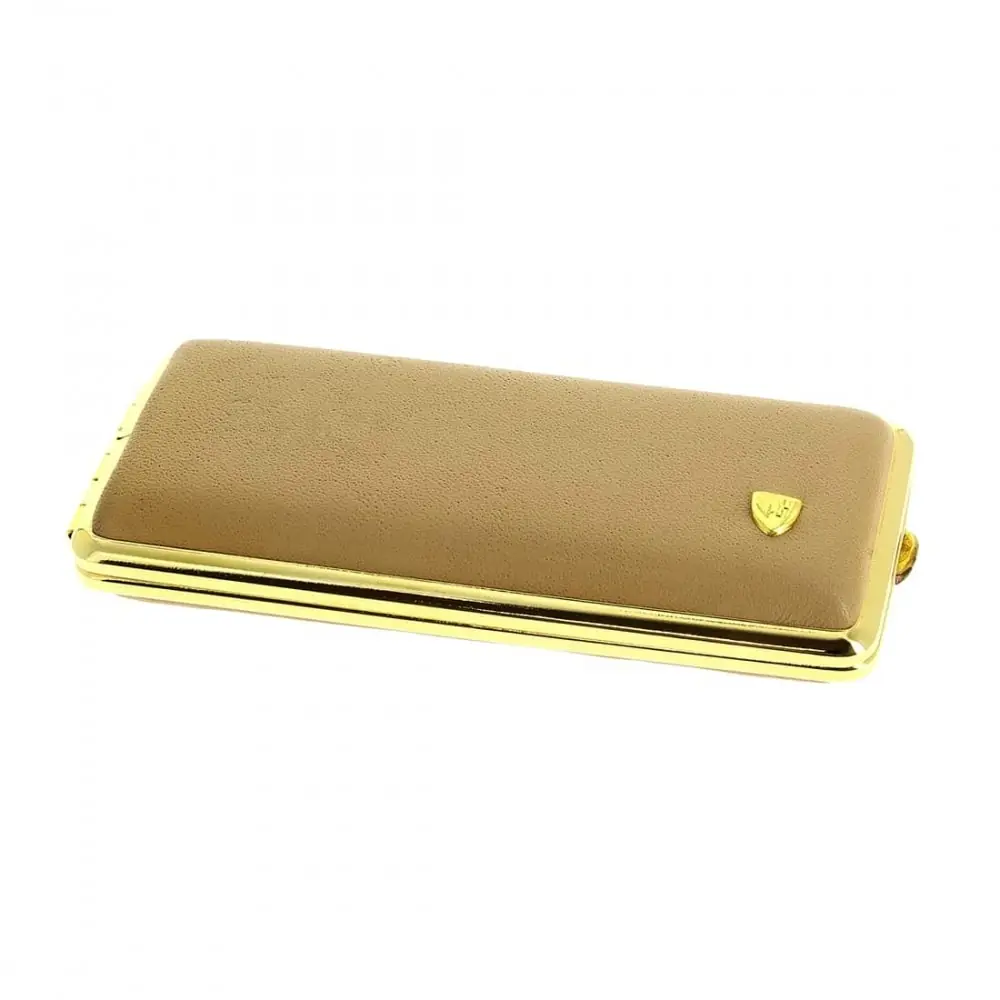 Stylish beige leather case holds up to 14 slim cigarettes securely.