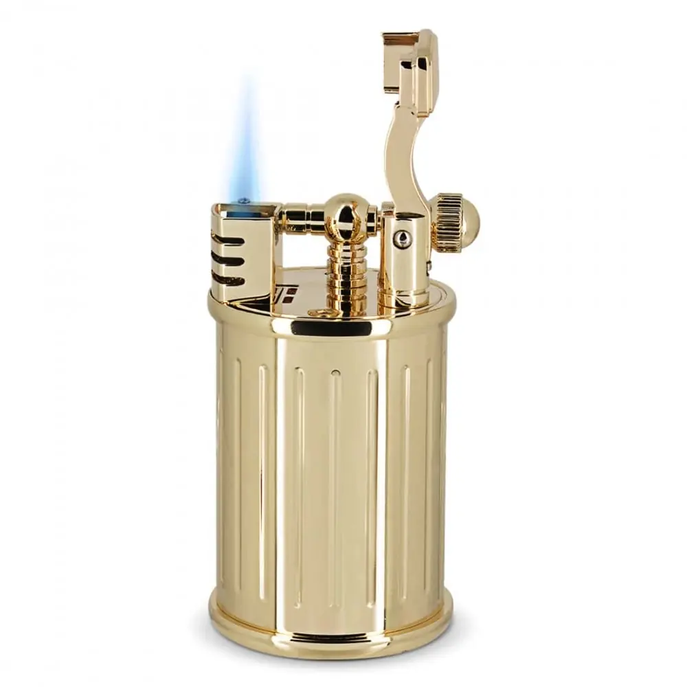 the vintage gold table lighter combines luxury and practicality with its glossy finish and retro design. refillable and durable it comes in a gift box with a spare flint for extended use.