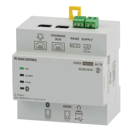 The Socomec DIRIS digiware M-50 and M-70 communication gateways are the access point for the DIRIS digiware system, centralising the 24 VDC power supply and communication in one single point. The M-50 and M-70 act as the Ethernet gateway for all the devices connected on the digiware or RS485 bus, and integrate a web server to configure the network parameters and to remotely display measurement data.Direct digiware and RS485 to Ethernet gateway Automatic detection of connected devices Easy setup using the embedded web server
