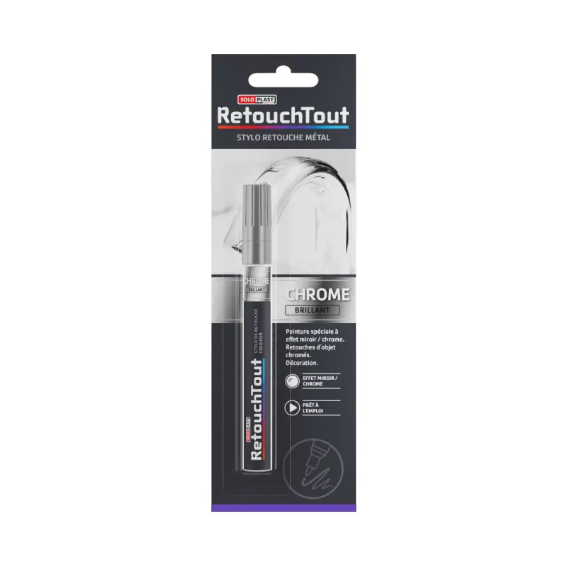 The SOLPLAST metal touch-up pen - Glossy chrome - 6ml is suitable for making quick touch-ups on metal surfaces. You can thus conceal scratches and imperfections, but also use this pen for decoration on metal objects.