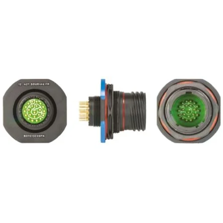 Souriau 8D Series Jam Nut Receptacle with Short PC Tail, Black Zinc Nickel. Souriau 8D series jam nut receptacle connectors with short PC tails, built in accordance to MIL-DTL-38999, series III type, are aluminium bodied, black zinc nickel, durable connectors designed for use within military and civil aerospace, marine and offshore equipment, defense and military ground personnel and industrial connector applications. These jam nut receptacle connectors feature a coupling thread and are 100% scoop proof and offer shell to shell continuity when mated. Souriau 8D series receptacle connectors have very high resistance to harsh environmental factors such as shock (300g, 3ms) and temperature extremes and offer over 500 mating and unmating operations. High Contact Density 100% scoop proof Male connector contacts
