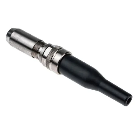 10TP series for harsh environments - Waterproof plugs. Connectors with extremely rugged design, corrosion-resistant, intended particularly for industrial applications requiring waterproof products. Waterproof to a submerged depth of 300 metres. Scoop-proof housings. Mechanical polarisation with 5 keys; screwed locking. Simple installation and completely reparable on site. Excellent resistance to oils, gas, sand, mud, hydrocarbons, salts, natural waste or human maltreatment. Typical applications: geophysics, railways, civil engineering, submarine instrumentation, water treatment and heavy industry. 10TP series straight plugs, available in 2arrangements: 4 x size 16 contacts or 7x size 20 contacts. Available in male or female version (the insulation blocks are interchangeable). Contacts must be soldered to the wire. Supplied with a protective sleeve, intended mainly to allow a bending radius for the output cable.