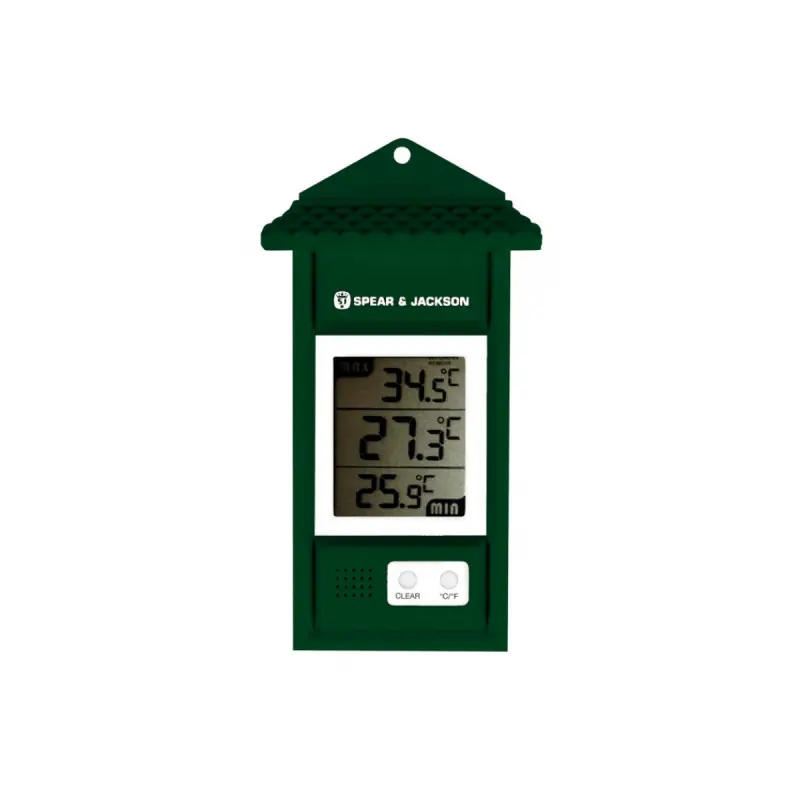 The mini thermometer SPEAR & JACKSON - maxi digital green - 15cm is ideal for giving you the indoor and outdoor temperature as well as the daily extremes recorded (minimum and maximum reached). It boasts very good reading and presentation quality. For optimal use, this thermometer should be placed vertically at 1m above the ground in the shade and sheltered.