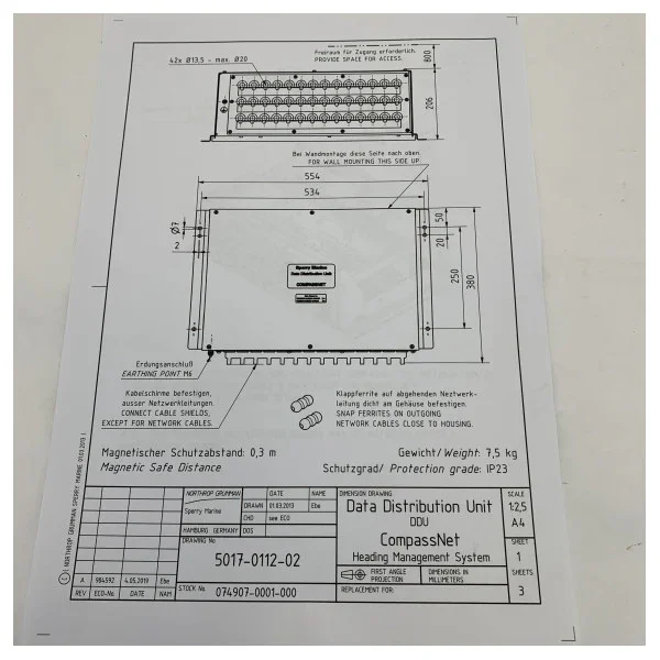 This Sperry Marine Gyrocompass Data Distribution Unit (DDU), model CompassNet (part number 074907-0001-00), is a crucial component for the reliable and accurate distribution of gyrocompass data to various navigation and control systems on board. It ensures that all connected systems, such as autopilots, radar, ECDIS, and VDR, receive consistent and synchronous course information. This is essential for safe and efficient navigation at sea.