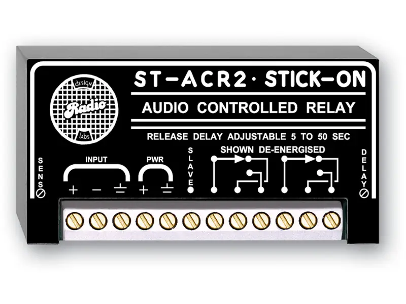 Two multiturn trimmers are provided. The SENS potentiometer adjusts the audio input sensitivity. A threshold LED facilitates accurate adjustment. The module can be set to trigger on signals between -30 dBu and 0 dBu. The DELAY control sets the time required for the relay to release when the audio drops below the threshold.The delay adjustment range for the ST-ACR2 is from 5 seconds to 50 seconds.