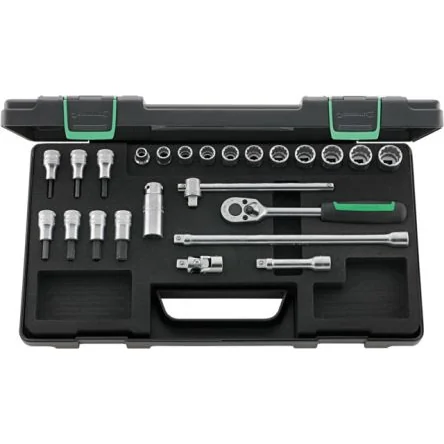 This 24-piece metric socket set includes deep sockets and a ratchet for versatile use in various applications.