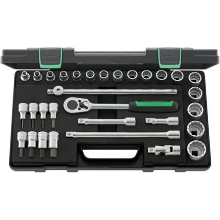 Durable 31-piece metric socket and bit set with ratchet for versatile use.