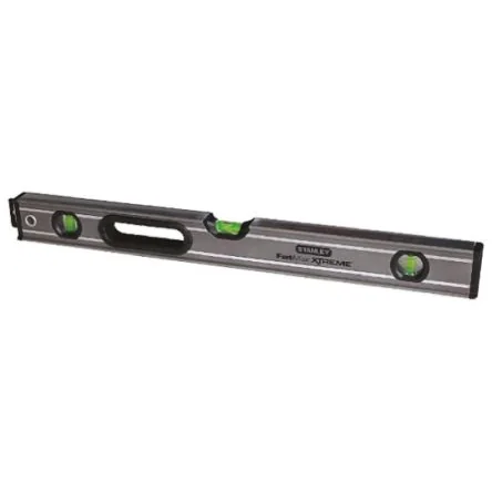 Stanley FatMax® Xtreme Box Beam Spirit Level with 3 vials. Stanley FatMax® durable box beam construction spirit levels are used for precision levelling measurement in a number of different jobs. The sturdy aluminium body ensures this handheld level is easy to use and is a simple way to maintain accuracy on the job. The vials have been magnified for better visibility. This hand tool features a box beam construction which is stronger than other spirit levels. These spirit levels are ideal for use by carpenters, bricklayers and general worksite applications. Spirit levels use a liquid filled vial with an air bubble inside to indicate how level or perpendicular a surface. Guides on the vial indicate when the bubble is centred showing the user that it is level. The range includes the following: ; 776-9826 776-9826 – 120cm Fatmax Xtreme box beam level ; 776-9835 776-9835 – 180cm Fatmax Xtreme box beam level. Features and Benefits:. Material – lightweight aluminium frame Number of vials - 3 Accuracy - ±0.5 mm/m Dual machined levelling surfaces for maximum accuracy Large ergonomic rubber hand grip Horizontal and vertical (pumb) level Highly accurate design Shock absorbing end caps – for increased durability and protection Magnified centre vial - easy to read. Typical Applications:. Spirit Levels and Inclinometers are tools designed for precision levelling measurement in a multitude of jobs, from something as simple as putting a shelf up making sure it does not slope, to checking how level bricks are in a new wall. They are commonly used by Carpenters Stonemasons Bricklayers Surveyors DIY Enthusiasts. FAQs Why so some spirit levels have more than one vial? This level has three vials, this system means that the one vial is used on horizontal level work and the two at either end are for vertical levelling work. How accurate are these levels? The FatMax® Xtreme™ Levels have an accuracy of 0.0005 in./in. (0.5mm/m).