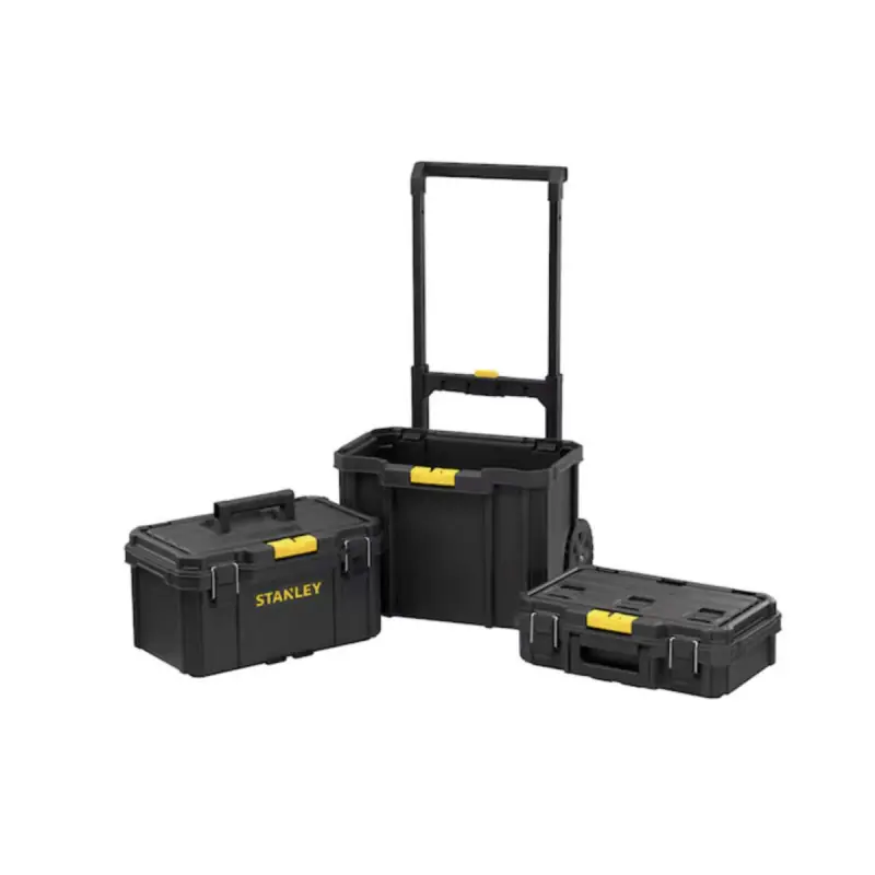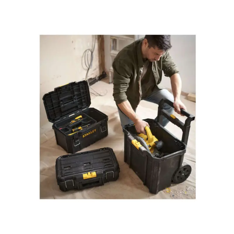 The 3-in-1 Quicklink STANLEY Trolley - capacity 45kg is a complete storage solution. It consists of a compact toolbox, a deep toolbox with an integrated tool holder, and a site box. The entire set is transported on two sturdy 17cm wheels. This allows you to carry all your equipment wherever you need it.