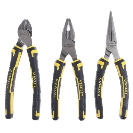 Stanley FatMax Pliers Set. This excellent set of pliers from Stanley consists of 3 high-quality pieces made from heat treated chrome-carbon steel. The bi-materials handles ensure a comfortable grip to ease user fatigue in prolonged use coupled with smooth operation. This set consisting of a combination plier, a long-nosed plier and side cutters is an excellent choice for those users who require a quality set from professionals (Electricians) to general DIY'er as they are essential tools to have handy. Features and Benefits:. Bi-material handle with secure grip grooving Resistant to most common chemicals including oils and acids Combination pliers - ideal for gripping and cutting Cutting edge high-frequency heat treated with hand ground finish for high-quality accurate cutting performance Diagonal Piano wire cutting pliers - ideal for cutting copper wire, aluminium and piano wire DIN / ASO / ANSI compliant Hand ground, induction hardened blade for long life and high-quality accuracy Heat treated high chrome steel forging for long life and durability Interlocking joint assembly for smooth cutting Slimline design with a high precision finish. Typical Applications:. Pliers are hand tools designed for a wide range of applications. Pliers, in general, are used for gripping, holding, twisting, bending, or even cutting materials such as wires. Pliers are commonly used by professionals e.g. electricians, plumbers, carpenters, gas engineers, car mechanics and all DIY enthusiasts. FAQs:. ;i>Are these pliers safe when working with electricity? ;/i> No, this set is not VDE approved and cannot be used with electricity. For an insulated and VDE approved option of pliers please see ; 136-7191 136-7191. Can these pliers be used for cutting wires? ;i>Yes, the set includes wire cutters so can be used for cutting cabling or wiring. ;/i> ;i>What do I get in the set? ;/i> The set contains three of the most popular plier types: Diagonal Cutters (165mm long) Long-nose Pliers (155mm long) Combination Pliers (165mm long)