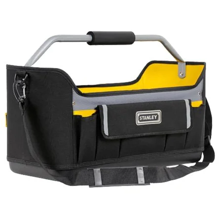 Stanley Open Tote. Stanley Open Tote Tool Bag, offers a secure, rigid and waterproof base. Designed with internal and external pockets, to protect tools from dust and water spills. Features and Benefits. Large open top allows for easy access Space for larger tool Aluminium carry handle with soft grip. Application Information. Stanley Open Tote, the ideal work mate for storing and transporting your tools and essentials. For use on the worksite, garage or around the home.