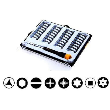 NF-E 74352, ISO 2380-1, DIN 5263, NF-E 74355, ISO 8764, DIN 5260. STANLEY 37 Piece Precision Screwdriver Set. Stanley 37 Piece Precision Nut Spinner and Bit Set, a complete screwdriver set which also includes the most common size bits. Ergonomic cushion grip handles provide comfort and control and each screwdriver has a steel blade with chrome finish. Supplied with a convenient tool case to store all your tools. Features and Benefits. Ergonomic handle designed providing a safe and comfortable grip Colour coded end for instant identification of the right tool, even in a busy toolbox Extendable handle for increased torque Clear storage case for easy storage and quick identification of missing bits. Typical Applications. This set of screwdrivers is typically used by professional tradesmen, engineers or those wishing to complete DIY. The screwdriver is one of the most essential hand tools in any workman ‘s kit. There are many situations and professions where a screwdriver is integral to carrying out a specific task revolving around loosening or tightening fasteners. Types of tips. Slotted: has a flattened tip used for screws with a straight linear intrusion across the head Phillips: have a cross shape recess and were designed to be able to take more torque Torx: type of screw head with a six-point star intrusion, designed to ensure even more torque can be applied, in mechanical production, for example, used on objects that need to get extremely tight Tamperproof Torx: Similar to standard torx bits but have a hole drilled through the centre, allowing the driver to slip over the pin. Hexagon: for loosening or tightening hex screws Pozidriv: an advanced version of a Phillips bit, a cross-shaped with straight sided flanks Square: Much less prone to cam-out compared to Phillips screwdriver bits Tri-wing: Three slotted wings with a small triangular hole in the centre. Mostly used in the aerospace industry. FAQ's. What do you get in the set?. Slotted: 1, 1.2, 1.5, 1.8, 2, 2.5, 3 mm Phillips: PH000, PH00, PH0 Pozidriv: PZ0, PZ1 Torx: T10, T15, T20 Security Torx: T10, T15, T20 Triwings: 2, 3, 4 mm Square: 2, 3 mm Hexagon: 0.9, 1.3, 1.5, 2, 2.5, 3, 4 mm