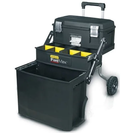 Stanley FatMax Mobile Workstation. The FatMax cantilever rolling workshop from Stanley includes a lower bin ideal for transporting big and bulky materials and equipment such as power tools or cans of paint. This tool storage workshop has a telescopic handle to enable easier manoeuvrability. The lower bin is ideal for big and bulky materials whereas the toolbox comes with a lift-out tray ideal for storing smaller tools such as nails and screws. The central drawer consists of removable dividers which provide extra storage for smaller tools and can easily be rearranged to provide more space for bigger tools. The Stanley FatMax mobile tool station is the ideal solution for tradesmen who need to transport large amounts of equipment and materials to and from the worksite. Tool boxes are used for tool storage and transporting all your required equipment. They provide a safe and secure way of transporting your tools and keeping them safe from damage. Tool storage is very important, having a tool box organiser helps keep equipment neat and tidy plus they are very easy to carry when attending small jobs. Features and Benefits:. Giant lower bin ideal for bulky materials and equipment Heavy-duty road tested wheels A large adjustable organiser for nails, screws and other small components Opens up easily into a 4 level workstation Removable dividers for ultimate space utilization Tool box with lift-out tray for smaller tools, which fits neatly into the fold-out lid Toolbox lid includes integrated V-groove for work with lumbers and pipes. Typical Applications:. Mobile workstations, tool boxes and tool chests are an essential accessory for storing a multitude of tools of all different shapes and sizes. They are made from a sturdy material and are easy to carry making them portable and easy to move around workshops, garages and even the home. They can generally be used in most environments for keeping your most essential tools close at hand. Our selection of tool boxes are ideal for Electrical and Industrial engineering Maintenance and Servicing applications Mechanics DIY enthusiast. What's in the box?. The Stanley FatMax mobile workstation contains a removable tray within the upper tool box and 4 removable inserts within the central compartment.