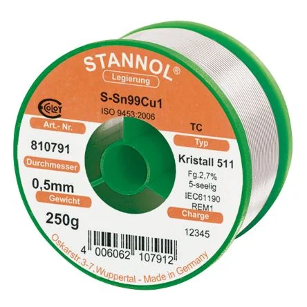 Stannol Kristall series. Stannol Kristall solder wires have been specially formulated to complement No Clean wave and reflow soldering processes. They are also applicable to repair operations carried out after a cleaning process, eliminating the need for further cleaning. Stannol Kristall solder wires provide fast soldering on copper and brass surfaces and solder coated materials. Activity of the halide activated versions on nickel is also good depending on the state of oxidation of the nickel finish. The good thermal stability of Stannol Kristall fluxes means that they are also suited to soldering applications requiring high melting temperature alloys. The resin and flux systems are designed to leave relatively low residues and to minimise residual activity. This is achieved by ensuring some decomposition and volatilisation takes place during the soldering process. In some situations, this may generate visible fuming but in all cases, rosin fumes must be removed from the breathing zone of operators. Features ; Benefits. Fast soldering (wide range of activities to suit all applications). Good spread (on copper, brass and nickel). Clear residues. Heat stable (low spitting). Mild odour