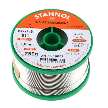 Fast soldering with Stannol's 1mm lead-free solder, ideal for various applications.