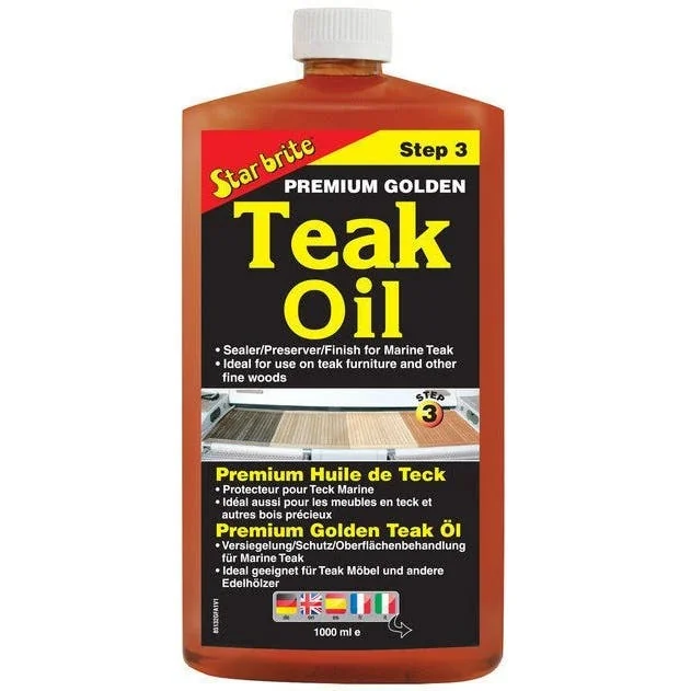 Star brite Premium Golden Teak Oil is a high-quality sealer, preserver, and finish designed specifically for marine teak and other fine woods. Utilizing ultra-refined natural oils and chemically modified oils, it forms high molecular weight polymers that withstand prolonged exposure to saltwater and harsh weather conditions. The addition of special high-technology additives protects the wood from the sun's damaging UV rays, ensuring maximum protection and enhancing the natural beauty of teak surfaces. This product is ideal for use on all fine woods and wood furniture.